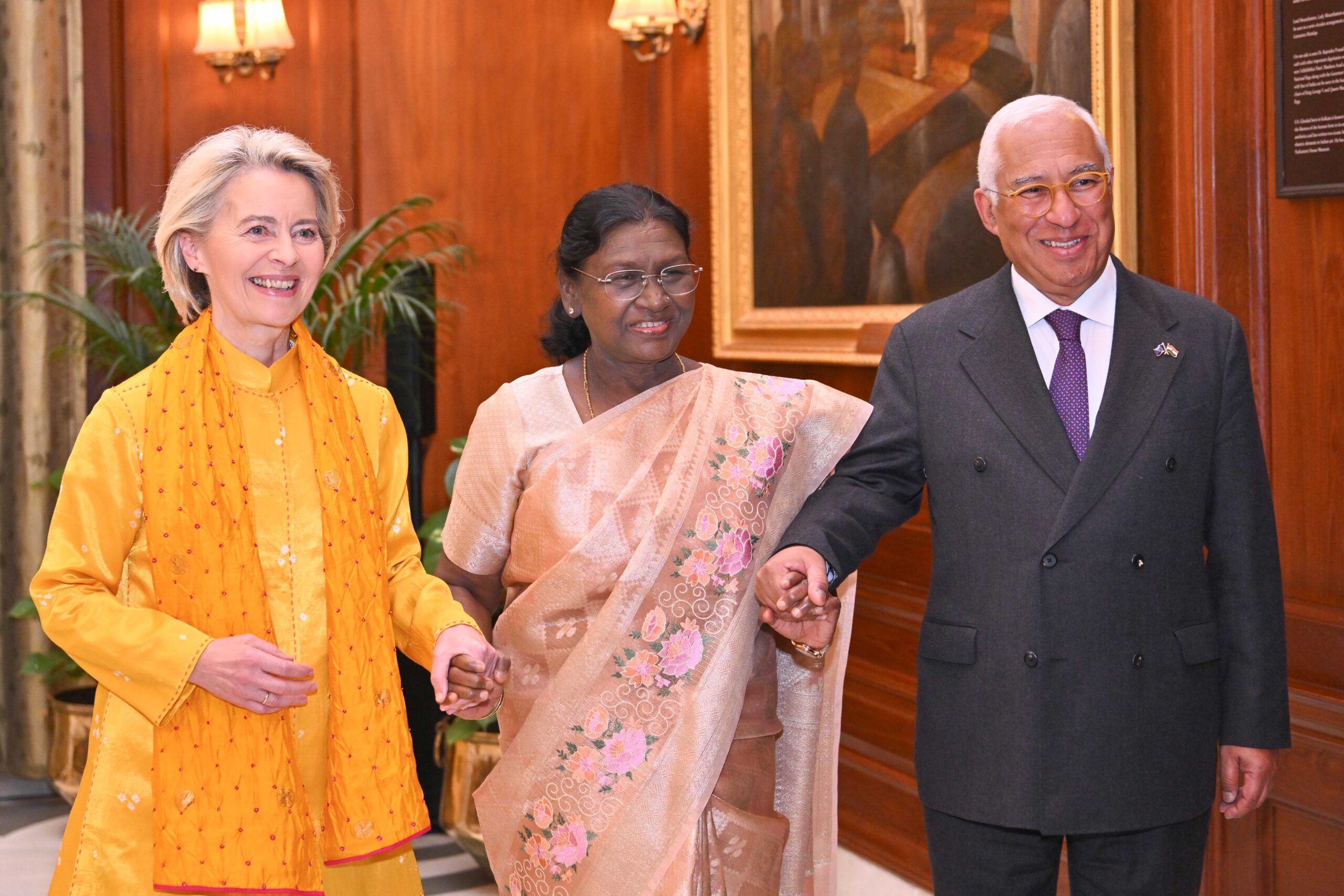 ਰਾਸ਼ਟਰਪਤੀ ਦ੍ਰੌਪਦੀ ਮੁਰਮੂ ਨੇ ਮੰਗਲਵਾਰ ਨੂੰ ਰਾਸ਼ਟਰਪਤੀ ਭਵਨ ਵਿੱਚ ਯੂਰਪੀ ਕੌਂਸਲ ਦੇ ਪ੍ਰਧਾਨ ਅੰਤੋਨਿਓ ਕੋਸਤਾ ਅਤੇ ਯੂਰਪੀ ਕਮਿਸ਼ਨ ਦੀ ਪ੍ਰਧਾਨ ਉਰਸੁਲਾ ਵਾਨ ਡਰ ਲੇਯਨ ਦੀ ਮੇਜ਼ਬਾਨੀ ਕੀਤੀ। ਇਹ ਭਾਰਤ–ਯੂਰਪੀ ਯੂਨੀਅਨ ਸਬੰਧਾਂ ਵਿੱਚ ਇੱਕ ਇਤਿਹਾਸਕ ਪਲ ਸੀ। ਦੋਵੇਂ ਯੂਰਪੀ ਨੇਤਾ ਭਾਰਤ ਦੇ 77ਵੇਂ ਗਣਤੰਤਰ ਦਿਵਸ ਸਮਾਰੋਹ ਦੇ ਮੁੱਖ ਮਹਿਮਾਨ ਸਨ—ਇਹ ਪਹਿਲੀ ਵਾਰ ਸੀ ਕਿ ਯੂਰਪੀ ਯੂਨੀਅਨ ਨੇ ਇਸ ਹੈਸਿਯਤ ਵਿੱਚ ਭਾਗ ਲਿਆ—ਜੋ ਭਾਰਤ–ਈਯੂ ਰਣਨੀਤਕ ਭਾਈਚਾਰੇ ਦੀ ਵਧਦੀ ਗਹਿਰਾਈ ਅਤੇ ਭਰੋਸੇ ਨੂੰ ਦਰਸਾਉਂਦਾ ਹੈ।