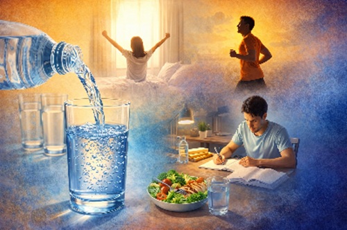 ਦਿਨ ਭਰ ਕੰਮ ਜਾਂ ਪੜ੍ਹਾਈ ਕਰਦੇ ਸਮੇਂ ਹਰ ਕੁਝ ਸਮੇਂ ਬਾਅਦ ਪਾਣੀ ਪੀਣਾ ਜ਼ਰੂਰੀ ਹੈ। ਇਸ ਨਾਲ ਸਰੀਰ ਵਿੱਚ ਥਕਾਵਟ ਘੱਟ ਹੁੰਦੀ ਹੈ ਅਤੇ ਧਿਆਨ ਕੇਂਦਰਿਤ ਰਹਿੰਦਾ ਹੈ। ਗਰਮੀ ਦੇ ਮੌਸਮ ਵਿੱਚ ਪਾਣੀ ਦੀ ਮਾਤਰਾ ਵਧਾ ਦੇਣੀ ਚਾਹੀਦੀ ਹੈ ਤਾਂ ਜੋ ਸਰੀਰ ਵਿੱਚ ਪਾਣੀ ਦੀ ਘਾਟ ਨਾ ਹੋਵੇ।