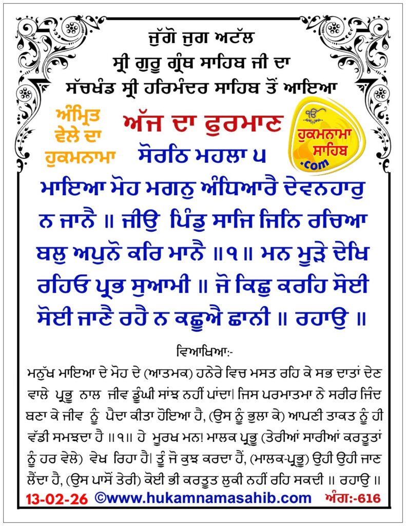 HomeHukamnama Sahibਹੁਕਮਨਾਮਾ ਸ੍ਰੀ ਦਰਬਾਰ ਸਾਹਿਬ ਅੰਮ੍ਰਿਤਸਰ Hukamnama Sahib ਹੁਕਮਨਾਮਾ ਸ੍ਰੀ ਦਰਬਾਰ ਸਾਹਿਬ ਅੰਮ੍ਰਿਤਸਰ By Gurpreet Singh February 13, 2026 0 11 Share FacebookTwitterPinterestWhatsApp Tags#Ajj da hukamnama#Dharmic post#Dharmic posta#hukamnama#Hukamnama amritsar#hukamnama sri darbar sahib amritsar Share FacebookTwitterPinterestWhatsApp Previous article‘ਆਪਰੇਸ਼ਨ ਲੋਟਸ’ ਤਹਿਤ ਭਾਜਪਾ ਨੇ ਕੀਤਾ ਸੰਪਰਕ : ’ਆਪ’ ਵਿਧਾਇਕਾ ਨਰਿੰਦਰ ਕੌਰ ਭਰਾਜNext articleਰਾਜਪੁਰਾ ਵਿੱਚ ਬਣੇਗਾ ਗੈਂਗਸਟਰ ਟਾਸਕ ਫੋਰਸ ਦਾ ਹੈੱਡ ਕੁਆਟਰ Gurpreet Singhhttps://rajneetiyug.com/ RELATED ARTICLES Hukamnama Sahib ਹੁਕਮਨਾਮਾ ਸ੍ਰੀ ਦਰਬਾਰ ਸਾਹਿਬ ਅੰਮ੍ਰਿਤਸਰ February 12, 2026 Hukamnama Sahib ਹੁਕਮਨਾਮਾ ਸ੍ਰੀ ਦਰਬਾਰ ਸਾਹਿਬ ਅੰਮ੍ਰਿਤਸਰ February 11, 2026 Hukamnama Sahib ਹੁਕਮਨਾਮਾ ਸ੍ਰੀ ਦਰਬਾਰ ਸਾਹਿਬ ਹਰਿਮੰਦਰ ਸਾਹਿਬ ਅੰਮ੍ਰਿਤਸਰ February 10, 2026 LEAVE A REPLY Cancel reply Comment: Please enter your comment! Name:* Please enter your name here Email:* You have entered an incorrect email address! Please enter your email address here Website: Save my name, email, and website in this browser for the next time I comment. - Advertisment - Most Popular ਰੂਸ ਵੱਲੋਂ WhatsApp ‘ਤੇ ਪਾਬੰਦੀ, ਦੇਸੀ ਸੁਪਰ ਐਪ MAX ਨੂੰ ਦਿੱਤਾ ਪ੍ਰੋਤਸਾਹਨ February 13, 2026 ਮਹਾਂਸ਼ਿਵਰਾਤਰੀ ਮੌਕੇ ਕਪੂਰਥਲਾ-ਫਗਵਾੜਾ ਵਿੱਚ ਸ਼ੋਭਾ ਯਾਤਰਾ ਰੂਟ ‘ਤੇ ਮੀਟ ਤੇ ਸ਼ਰਾਬ ਦੀਆਂ ਦੁਕਾਨਾਂ ਬੰਦ ਰਹਿਣਗੀਆਂ February 13, 2026 ਜਲੰਧਰ ਸਰਾਫਾ ਬਾਜ਼ਾਰ ਵਿੱਚ ਸੋਨੇ-ਚਾਂਦੀ ਦੀਆਂ ਕੀਮਤਾਂ ਡਿੱਗੀਆਂ, ਖਰੀਦਦਾਰਾਂ ਨੂੰ ਰਾਹਤ February 13, 2026 ਇੰਡੋਨੇਸ਼ੀਆ ਵਿੱਚ 4.4 ਤੀਬਰਤਾ ਦਾ ਭੂਚਾਲ, ਕੋਈ ਵੱਡਾ ਨੁਕਸਾਨ ਨਹੀਂ February 13, 2026 Load more Recent Comments