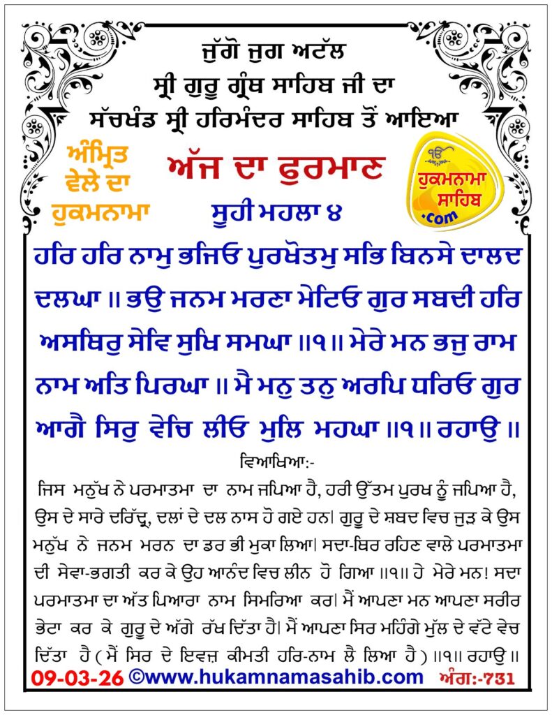 HomeHukamnama Sahibਹੁਕਮਨਾਮਾ ਸ੍ਰੀ ਦਰਬਾਰ ਸਾਹਿਬ ਅੰਮ੍ਰਿਤਸਰ Hukamnama Sahib ਹੁਕਮਨਾਮਾ ਸ੍ਰੀ ਦਰਬਾਰ ਸਾਹਿਬ ਅੰਮ੍ਰਿਤਸਰ By Gurpreet Singh March 9, 2026 0 1 Share FacebookTwitterPinterestWhatsApp Tags#Ajj da hukamnama#Amritsar hukamnama#Dharmic posts#hukamnama#hukamnama sri darbar sahib Share FacebookTwitterPinterestWhatsApp Previous articleਜੰਮੂ ਕਸ਼ਮੀਰ ‘ਚ ਮੌਸਮ ਦਾ ਬਦਲੇਗਾ ਮਿਜਾਜ਼Next articleਗੈਂਗਸਟਰਾਂ ‘ਤੇ ਵਾਰ ਮੁਹਿੰਮ ਦਾ 47ਵਾਂ ਦਿਨ: 477 ਥਾਵਾਂ ‘ਤੇ ਛਾਪੇ, 147 ਗ੍ਰਿਫ਼ਤਾਰ Gurpreet Singhhttps://rajneetiyug.com/ RELATED ARTICLES Hukamnama Sahib ਹੁਕਮਨਾਮਾ ਸ੍ਰੀ ਦਰਬਾਰ ਸਾਹਿਬ ਅੰਮ੍ਰਿਤਸਰ March 4, 2026 Hukamnama Sahib ਹੁਕਮਨਾਮਾ ਸ੍ਰੀ ਦਰਬਾਰ ਸਾਹਿਬ ਅੰਮ੍ਰਿਤਸਰ March 3, 2026 Hukamnama Sahib ਹੁਕਮਨਾਮਾ ਸ੍ਰੀ ਦਰਬਾਰ ਸਾਹਿਬ ਅੰਮ੍ਰਿਤਸਰ March 2, 2026 LEAVE A REPLY Cancel reply Comment: Please enter your comment! Name:* Please enter your name here Email:* You have entered an incorrect email address! Please enter your email address here Website: Save my name, email, and website in this browser for the next time I comment. - Advertisment - Most Popular ਕੌਮਾਂਤਰੀ ਮਹਿਲਾ ਦਿਵਸ ਮੌਕੇ 31 ਮਹਿਲਾਵਾਂ ਨੂੰ ਰੰਜੀਤਾ ਪੰਨੂ, ਗੋਗੀਆ ਤੇ ਸ਼ਾਇਨਾ ਕਪੂਰ ਵੱਲੋਂ ਸਨਮਾਨ March 9, 2026 ਰਾਜਪਾਲ ਨੇ ਘੋੜਿਆਂ ਦੀ ਪੰਜਾਬ ਨਸਲ ਦੇ ਤਿੰਨ ਰੋਜ਼ਾ ਹੈਰੀਟੇਜ ਸ਼ੋਅ ਦੇ ਜੇਤੂਆਂ ਨੂੰ ਇਨਾਮ ਵੰਡੇ March 9, 2026 ਰਾਜਪਾਲ ਗੁਲਾਬ ਚੰਦ ਕਟਾਰੀਆ ਪਟਿਆਲਾ ਦੇ ਮਾਤਾ ਸ੍ਰੀ ਕਾਲੀ ਦੇਵੀ ਮੰਦਰ ਵਿਖੇ ਨਤਮਸਤਕ ਹੋਏ March 9, 2026 ਗਰਮੀਆਂ ਵਿੱਚ ਸਿਹਤ ਦੀ ਸੰਭਾਲ ਕਿਵੇਂ ਕਰੀਏ? ਆਓ ਜਾਣਦੇ ਹਾਂ March 9, 2026 Load more Recent Comments