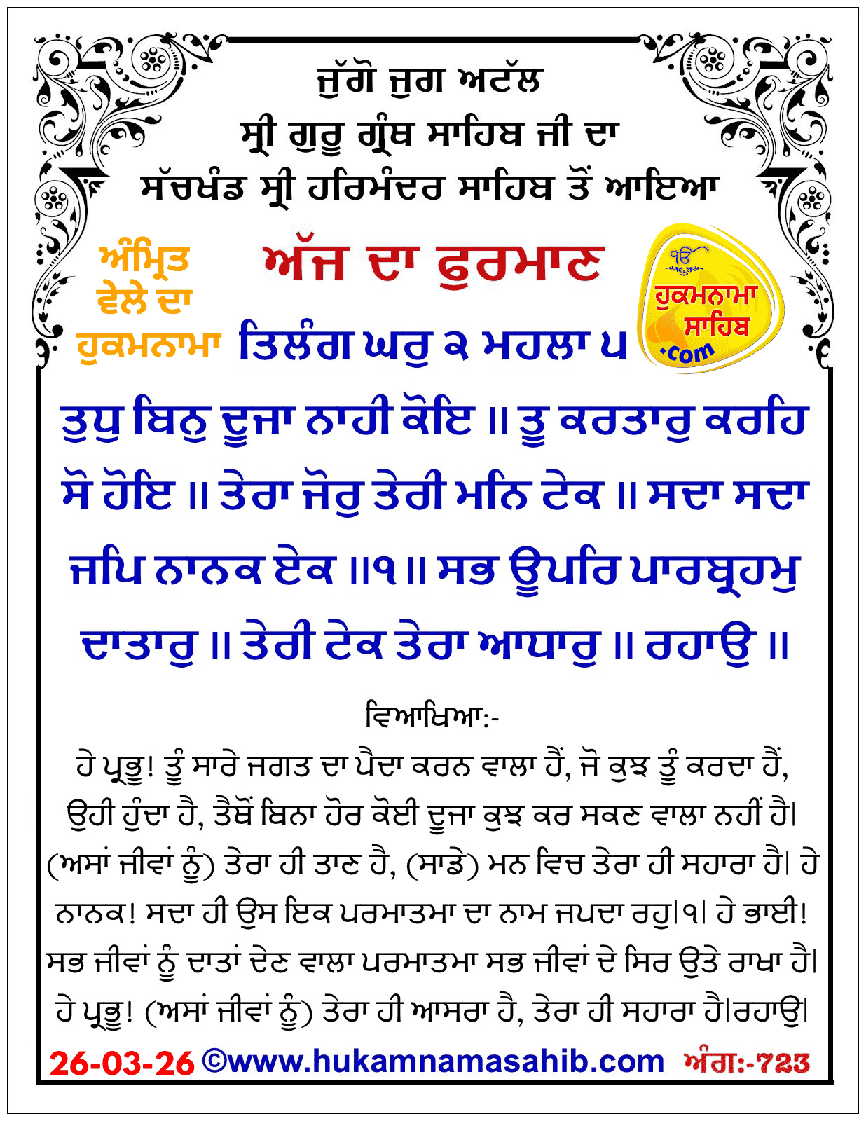 HomeHukamnama Sahibਹੁਕਮਨਾਮਾ ਸ੍ਰੀ ਦਰਬਾਰ ਸਾਹਿਬ ਅੰਮ੍ਰਿਤਸਰ Hukamnama Sahib ਹੁਕਮਨਾਮਾ ਸ੍ਰੀ ਦਰਬਾਰ ਸਾਹਿਬ ਅੰਮ੍ਰਿਤਸਰ By Gurpreet Singh March 26, 2026 0 2 Share FacebookTwitterPinterestWhatsApp Tags#Ajj da hukamnama#Dharmic post#hukamnama#Hukamnama Amitsar Sahib Share FacebookTwitterPinterestWhatsApp Previous article“ਨਸ਼ਿਆਂ ਖ਼ਿਲਾਫ਼ ਜੰਗ ਜਿੱਤਣ ਲਈ ਜਨਤਾ ਦਾ ਸਹਿਯੋਗ ਬਹੁਤ ਜ਼ਰੂਰੀ”- ਮਨੀਸ਼ ਸਿਸੋਦੀਆNext articleਜਗਰਾਓ ਵਿੱਚ ਐੱਨ.ਜੀ.ਟੀ. ਦੀ ਰੋਕ ਦੇ ਬਾਵਜੂਦ ਨਾਜਾਇਜ਼ ਮਾਈਨਿੰਗ ਦੇ ਦੋਸ਼ Gurpreet Singhhttps://rajneetiyug.com/ RELATED ARTICLES Hukamnama Sahib ਹੁਕਮਨਾਮਾ ਸ੍ਰੀ ਦਰਬਾਰ ਸਾਹਿਬ ਅੰਮ੍ਰਿਤਸਰ March 24, 2026 Hukamnama Sahib ਹੁਕਮਨਾਮਾ ਸ੍ਰੀ ਦਰਬਾਰ ਸਾਹਿਬ ਅੰਮ੍ਰਿਤਸਰ March 23, 2026 Hukamnama Sahib Today’s Hukamnama Sri Darbar Sahib March 22, 2026 LEAVE A REPLY Cancel reply Comment: Please enter your comment! Name:* Please enter your name here Email:* You have entered an incorrect email address! Please enter your email address here Website: Save my name, email, and website in this browser for the next time I comment. - Advertisment - Most Popular ਈਰਾਨ ਜੰਗ ਖਤਮ ਕਰਨ ਲਈ ਟਰੰਪ ਦੀ 15 ਨੁਕਾਤੀ ਯੋਜਨਾ ਕੀ ਹੈ? ਤੇਹਰਾਨ ਨੇ ਕਿਉਂ ਕੀਤਾ ਖਾਰਜ ਅਤੇ ਕੀ ਹਨ ਉਸਦੀਆਂ ਸ਼ਰਤਾਂ March 26, 2026 ਟ੍ਰੇਡਰ ਕਮਿਸ਼ਨ ਦੀ ਹਲਕਾ ਰਾਜਪੁਰਾ ਦੇ ਵਪਾਰੀਆਂ ਨਾਲ ਬੈਠਕ ‘ਚ ਅਹਿਮ ਮੁੱਦਿਆਂ ‘ਤੇ ਚਰਚਾ March 26, 2026 ਪਟਿਆਲਾ ਵਿੱਚ ਵਿਜੀਲੈਂਸ ਦੀ ਵੱਡੀ ਕਾਰਵਾਈ: ਏਐਸਆਈ 20 ਹਜ਼ਾਰ ਰੁਪਏ ਰਿਸ਼ਵਤ ਲੈਂਦੇ ਕਾਬੂ March 26, 2026 ਹਰਿਆਣਾ ਵਿੱਚ ਮੌਸਮ ਦਾ ਮਿਜ਼ਾਜ ਬਦਲਿਆ, ਕਈ ਜ਼ਿਲ੍ਹਿਆਂ ‘ਚ ਮੀਂਹ ਤੇ ਤੂਫ਼ਾਨ ਦਾ ਅਲਰਟ March 26, 2026 Load more Recent Comments
