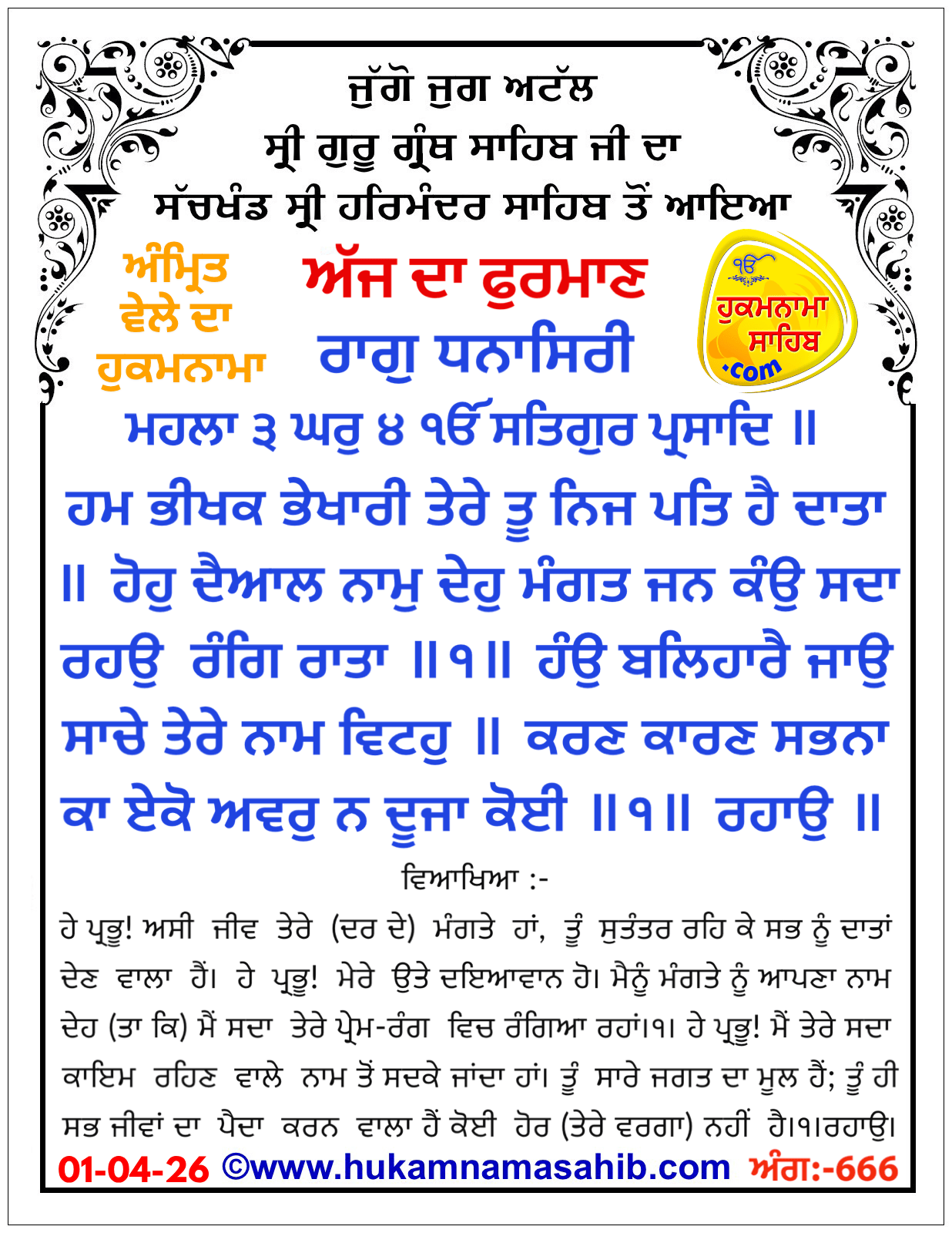 HomeHukamnama Sahibਹੁਕਮਨਾਮਾ ਸ੍ਰੀ ਦਰਬਾਰ ਸਾਹਿਬ ਅੰਮ੍ਰਿਤਸਰ Hukamnama Sahib ਹੁਕਮਨਾਮਾ ਸ੍ਰੀ ਦਰਬਾਰ ਸਾਹਿਬ ਅੰਮ੍ਰਿਤਸਰ By Gurpreet Singh April 1, 2026 0 1 Share FacebookTwitterPinterestWhatsApp Tags#Ajj da hukamnama#Dharmic post#hukamnama#Hukamnama amritsar Share FacebookTwitterPinterestWhatsApp Previous articleਪੀਪੀਐਸਸੀ ਵੱਲੋਂ ਪੀਸੀਐਸ ਦੀ ਮੇਨ ਪ੍ਰੀਖਿਆ ਲਈ ਪੂਰੀ ਤਿਆਰੀ; ਪਟਿਆਲਾ ‘ਚ 12 ਕੇਂਦਰ ਸਥਾਪਤNext articleਪੀ.ਆਰ.ਟੀ.ਸੀ ਚੇਅਰਮੈਨ ਹਰਪਾਲ ਜੁਨੇਜਾ ਨੇ ਹਰਪਾਲ ਸਿੰਘ ਚੀਮਾ ਨੂੰ ਟਰਾਂਸਪੋਰਟ ਮੰਤਰੀ ਬਨਣ ‘ਤੇ ਵਧਾਈ ਦਿੰਦਿਆਂ ਪੀ.ਆਰ.ਟੀ.ਸੀ ਦੀ ਕਾਰਗੁਜਾਰੀ ਤੋਂ ਜਾਣੂ ਕਰਵਾਇਆ Gurpreet Singhhttps://rajneetiyug.com/ RELATED ARTICLES Hukamnama Sahib ਹੁਕਮਨਾਮਾ ਸ੍ਰੀ ਦਰਬਾਰ ਸਾਹਿਬ ਅੰਮ੍ਰਿਤਸਰ March 31, 2026 Hukamnama Sahib Hukamnama Sri Darbar Sahib, Amritsar, Date 31-03-2026 March 31, 2026 Hukamnama Sahib ਹੁਕਮਨਾਮਾ ਸ੍ਰੀ ਦਰਬਾਰ ਸਾਹਿਬ ਅੰਮ੍ਰਿਤਸਰ March 28, 2026 LEAVE A REPLY Cancel reply Comment: Please enter your comment! Name:* Please enter your name here Email:* You have entered an incorrect email address! Please enter your email address here Website: Save my name, email, and website in this browser for the next time I comment. - Advertisment - Most Popular ਪੰਜਾਬ ਬਣਿਆ ਯੂਨੀਵਰਸਲ ਸਿਹਤ ਕਵਰੇਜ ਵਿੱਚ ਮੋਹਰੀ, ਹਰ ਪਰਿਵਾਰ ਨੂੰ 10 ਲੱਖ ਤੱਕ ਮੁਫ਼ਤ ਇਲਾਜ April 1, 2026 ਪੀ.ਆਰ.ਟੀ.ਸੀ ਚੇਅਰਮੈਨ ਹਰਪਾਲ ਜੁਨੇਜਾ ਨੇ ਹਰਪਾਲ ਸਿੰਘ ਚੀਮਾ ਨੂੰ ਟਰਾਂਸਪੋਰਟ ਮੰਤਰੀ ਬਨਣ ‘ਤੇ ਵਧਾਈ ਦਿੰਦਿਆਂ ਪੀ.ਆਰ.ਟੀ.ਸੀ ਦੀ ਕਾਰਗੁਜਾਰੀ ਤੋਂ ਜਾਣੂ ਕਰਵਾਇਆ April 1, 2026 ਪੀਪੀਐਸਸੀ ਵੱਲੋਂ ਪੀਸੀਐਸ ਦੀ ਮੇਨ ਪ੍ਰੀਖਿਆ ਲਈ ਪੂਰੀ ਤਿਆਰੀ; ਪਟਿਆਲਾ ‘ਚ 12 ਕੇਂਦਰ ਸਥਾਪਤ March 31, 2026 ਲਾਸ ਏਂਜਲਸ ‘ਚ ਰਿਲੀਜ਼ ਹੋਇਆ ‘ਰਾਮਾਇਣ’ ਦਾ ਟੀਜ਼ਰ, ਦਰਸ਼ਕ ਹੋਏ ਭਾਵੁਕ March 31, 2026 Load more Recent Comments