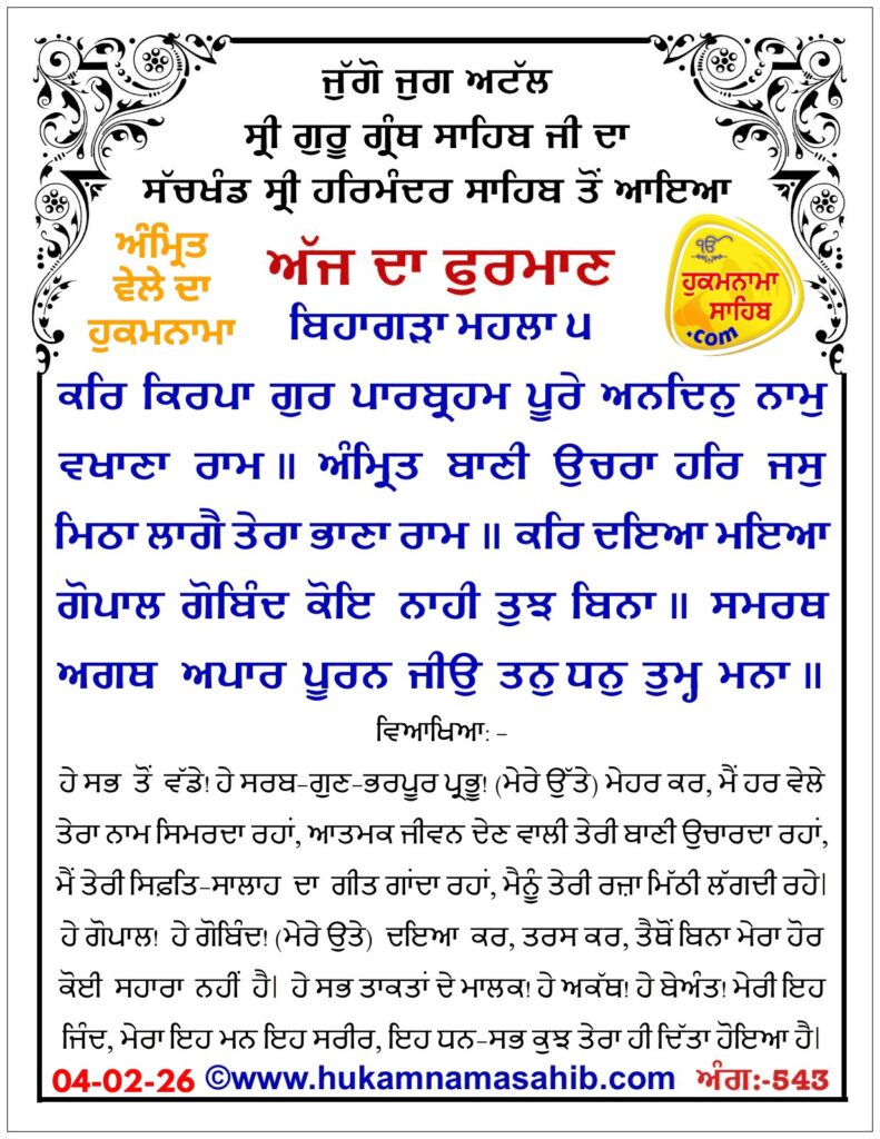 HomeHukamnama Sahibਹੁਕਮਨਾਮਾ ਸ੍ਰੀ ਦਰਬਾਰ ਸਾਹਿਬ ਅੰਮ੍ਰਿਤਸਰ Hukamnama Sahib ਹੁਕਮਨਾਮਾ ਸ੍ਰੀ ਦਰਬਾਰ ਸਾਹਿਬ ਅੰਮ੍ਰਿਤਸਰ By Gurpreet Singh February 4, 2026 0 8 Share FacebookTwitterPinterestWhatsApp Tags#Ajj da hukamnama#Dharmic post#hukamnama#hukamnama sri darbar sahib amritsar Share FacebookTwitterPinterestWhatsApp Previous articleਹਲਵਾਰਾ ਇੰਟਰਨੈਸ਼ਨਲ ਏਅਰਪੋਰਟ ਉਦਘਾਟਨ ਸਮਾਰੋਹNext articleਮਜੀਠੀਆ ਨੂੰ ਮਿਲੀ ਜ਼ਮਾਨਤ ਦੋਸ਼-ਮੁਕਤੀ ਨਹੀਂ, ਭ੍ਰਿਸ਼ਟਾਚਾਰ ਦੇ ਦੋਸ਼ ਬਰਕਰਾਰ: ਅਮਨ ਅਰੋੜਾ Gurpreet Singhhttps://rajneetiyug.com/ RELATED ARTICLES Hukamnama Sahib ਅੱਜ ਦਾ ਹੁਕਮਨਾਮਾ ਸ੍ਰੀ ਦਰਬਾਰ ਸਾਹਿਬ ਅੰਮ੍ਰਿਤਸਰ February 3, 2026 Hukamnama Sahib ਹੁਕਮਨਾਮਾ ਸ੍ਰੀ ਦਰਬਾਰ ਸਾਹਿਬ ਅੰਮ੍ਰਿਤਸਰ February 2, 2026 Hukamnama Sahib ਹੁਕਮਨਾਮਾ ਸ੍ਰੀ ਦਰਬਾਰ ਸਾਹਿਬ ਅੰਮ੍ਰਿਤਸਰ January 31, 2026 LEAVE A REPLY Cancel reply Comment: Please enter your comment! Name:* Please enter your name here Email:* You have entered an incorrect email address! Please enter your email address here Website: Save my name, email, and website in this browser for the next time I comment. - Advertisment - Most Popular ਐਸ. ਜੈਸ਼ੰਕਰ ਦੀ ਅਮਰੀਕੀ ਖਜ਼ਾਨਾ ਸਕੱਤਰ ਸਕਾਟ ਬੇਸੈਂਟ ਨਾਲ ਮੁਲਾਕਾਤ February 4, 2026 ਵੋਟਰ ਸੂਚੀ ਰਿਵੀਜ਼ਨ ਮਾਮਲਾ: ਮੁੱਖ ਮੰਤਰੀ ਮਮਤਾ ਬੈਨਰਜੀ ਸੁਪਰੀਮ ਕੋਰਟ ਪਹੁੰਚੀ February 4, 2026 ਗ੍ਰਹਿ ਮੰਤਰੀ ਅਮਿਤ ਸ਼ਾਹ 5 ਤੋਂ 7 ਫਰਵਰੀ ਤੱਕ ਜੰਮੂ-ਕਸ਼ਮੀਰ ਦੌਰੇ ‘ਤੇ February 4, 2026 ਕਿਸਾਨ-ਮਜ਼ਦੂਰ ਸੰਘਰਸ਼ ਕਮੇਟੀ ਦਾ 5 ਫਰਵਰੀ ਨੂੰ ਪ੍ਰਦਰਸ਼ਨ ਦਾ ਐਲਾਨ February 4, 2026 Load more Recent Comments