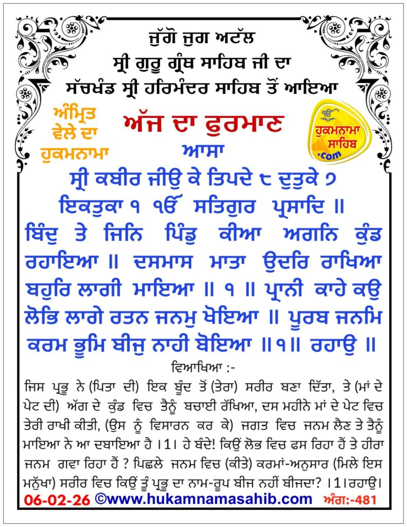 HomeHukamnama Sahibਹੁਕਮਨਾਮਾ ਸ੍ਰੀ ਦਰਬਾਰ ਸਾਹਿਬ ਅੰਮ੍ਰਿਤਸਰ Hukamnama Sahib ਹੁਕਮਨਾਮਾ ਸ੍ਰੀ ਦਰਬਾਰ ਸਾਹਿਬ ਅੰਮ੍ਰਿਤਸਰ By Gurpreet Singh February 6, 2026 0 14 Share FacebookTwitterPinterestWhatsApp Share FacebookTwitterPinterestWhatsApp Previous articleਐਲੋਵੇਰਾ: ਕੁਦਰਤੀ ਤਰੀਕੇ ਨਾਲ ਸਿਹਤ ਅਤੇ ਸੁੰਦਰਤਾ ਲਈNext articlePSEB ਨੇ ਪ੍ਰਾਈਵੇਟ ਸਕੂਲਾਂ ਨੂੰ ਦਿੱਤੀ ਸਖ਼ਤ ਚੇਤਾਵਨੀ Gurpreet Singhhttps://rajneetiyug.com/ RELATED ARTICLES Hukamnama Sahib ਹੁਕਮਨਾਮਾ ਸ੍ਰੀ ਦਰਬਾਰ ਸਾਹਿਬ ਅੰਮ੍ਰਿਤਸਰ February 5, 2026 Hukamnama Sahib ਹੁਕਮਨਾਮਾ ਸ੍ਰੀ ਦਰਬਾਰ ਸਾਹਿਬ ਅੰਮ੍ਰਿਤਸਰ February 4, 2026 Hukamnama Sahib ਅੱਜ ਦਾ ਹੁਕਮਨਾਮਾ ਸ੍ਰੀ ਦਰਬਾਰ ਸਾਹਿਬ ਅੰਮ੍ਰਿਤਸਰ February 3, 2026 LEAVE A REPLY Cancel reply Comment: Please enter your comment! Name:* Please enter your name here Email:* You have entered an incorrect email address! Please enter your email address here Website: Save my name, email, and website in this browser for the next time I comment. - Advertisment - Most Popular ਇਸਲਾਮਾਬਾਦ ਵਿੱਚ ਜੁਮੇ ਦੀ ਨਮਾਜ਼ ਦੌਰਾਨ ਭਿਆਨਕ ਧਮਾਕਾ, 10 ਮੌਤਾਂ, ਦਰਜਨ ਤੋਂ ਵੱਧ ਜ਼ਖ਼ਮੀ February 6, 2026 ਕਾਂਗਰਸ ਵੱਲੋਂ ਡਾ. ਨਵਜੋਤ ਕੌਰ ਸਿੱਧੂ ਪਾਰਟੀ ਵਿੱਚੋਂ ਬਾਹਰ, ਪੰਜਾਬ ਦੀ ਸਿਆਸਤ ਵਿੱਚ ਹਲਚਲ February 6, 2026 ਫਿਰੋਜ਼ਪੁਰ ਪੁਲਿਸ ਦੀ ਵੱਡੀ ਕਾਰਵਾਈ: 6 ਚੋਰੀ ਗਿਰੋਹ ਬੇਨਕਾਬ February 6, 2026 ਪੰਜਾਬ ’ਚ ਸੀਤ ਲਹਿਰ ਦੀ ਤੀਬਰਤਾ ਘਟੀ, ਧੁੱਪ ਨਾਲ ਮਿਲੀ ਰਾਹਤ; ਅਗਲੇ ਦਿਨਾਂ ’ਚ ਮੌਸਮ ਖੁਸ਼ਕ ਰਹਿਣ ਦੀ ਸੰਭਾਵਨਾ February 6, 2026 Load more Recent Comments