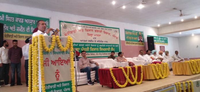 ਮਾਨਸਾ: ਖੇਤੀਬਾੜੀ ਤੇ ਕਿਸਾਨ ਭਲਾਈ ਵਿਭਾਗ ਵੱਲੋਂ ਸਾਉਣੀ 2026 ਦੀਆਂ ਫਸਲਾਂ ਬਾਰੇ ਨਵੀਨਤਮ ਤਕਨੀਕੀ ਜਾਣਕਾਰੀ ਦੇਣ ਲਈ ਡਾਇਰੈਕਟਰ ਖੇਤੀਬਾੜੀ ਅਤੇ ਕਿਸਾਨ ਭਲਾਈ ਵਿਭਾਗ ਪੰਜਾਬ ਗੁਰਜੀਤ ਸਿੰਘ ਬਰਾੜ ਦੇ ਦਿਸ਼ਾ—ਨਿਰਦੇਸ਼ਾਂ ਅਤੇ ਮੁੱਖ ਖੇਤੀਬਾੜੀ ਅਫ਼ਸਰ ਹਰਵਿੰਦਰ ਸਿੰਘ ਸਿੱਧੂ ਦੀ ਅਗਵਾਈ ਹੇਠ ਆਤਮਾ ਸਕੀਮ ਦੇ ਸਹਿਯੋਗ ਨਾਲ ਜ਼ਿਲ੍ਹਾ ਪੱਧਰੀ ਕਿਸਾਨ ਸਿਖਲਾਈ ਕੈਂਪ ਲਗਾਇਆ ਗਿਆ ।