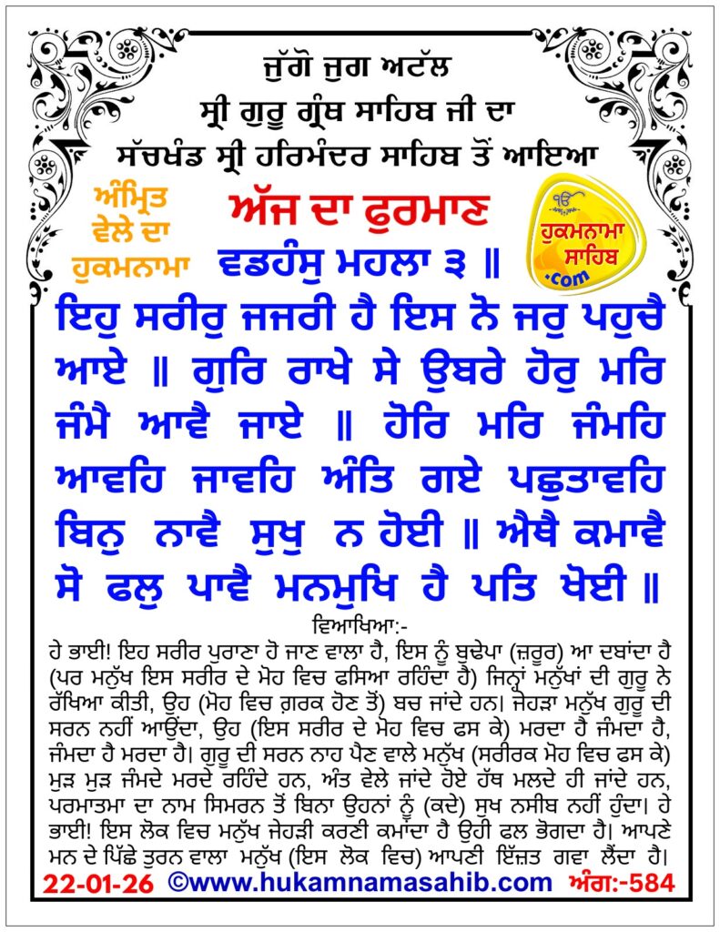 HomeHukamnama Sahibਅੱਜ ਦਾ ਹੁਕਮਨਾਮਾ ਸ੍ਰੀ ਦਰਬਾਰ ਸਾਹਿਬ ਅੰਮ੍ਰਿਤਸਰ Hukamnama Sahib ਅੱਜ ਦਾ ਹੁਕਮਨਾਮਾ ਸ੍ਰੀ ਦਰਬਾਰ ਸਾਹਿਬ ਅੰਮ੍ਰਿਤਸਰ By Gurpreet Singh January 22, 2026 0 23 Share FacebookTwitterPinterestWhatsApp Tags#Ajj da hukamnama#hukamnama#Hukamnama amritsar#hukamnama sri darbar sahib amritsar Share FacebookTwitterPinterestWhatsApp Previous articleਪੰਜਾਬ ਵਿੱਚ ਵੱਡੇ ਪੱਧਰ ’ਤੇ ਪ੍ਰਸ਼ਾਸਨਿਕ ਬਦਲਾਅ, 26 ਅਫ਼ਸਰਾਂ ਅਤੇ 4 ਡਿਪਟੀ ਕਮਿਸ਼ਨਰਾਂ ਦੀ ਤਬਾਦਲਾNext articleਆਈ.ਏ.ਐਸ ਅਧਿਕਾਰੀ ਪ੍ਰੀਤੀ ਯਾਦਵ ਮਾਰਕਫੈਡ ‘ਚ ਮੈਨੇਜਿੰਗ ਡਾਇਰੈਕਟਰ ਨਿਯੁਕਤ Gurpreet Singhhttps://rajneetiyug.com/ RELATED ARTICLES Hukamnama Sahib ਹੁਕਮਨਾਮਾ ਸ੍ਰੀ ਦਰਬਾਰ ਸਾਹਿਬ ਅੰਮ੍ਰਿਤਸਰ January 31, 2026 Hukamnama Sahib ਅੱਜ ਦਾ ਹੁਕਮਨਾਮਾ ਸ੍ਰੀ ਹਰਿਮੰਦਿਰ ਸਾਹਿਬ ਅੰਮ੍ਰਿਤਸਰ January 30, 2026 Hukamnama Sahib ਅੱਜ ਦਾ ਹੁਕਮਨਾਮਾ ਸ੍ਰੀ ਦਰਬਾਰ ਸਾਹਿਬ ਅੰਮ੍ਰਿਤਸਰ January 29, 2026 LEAVE A REPLY Cancel reply Comment: Please enter your comment! Name:* Please enter your name here Email:* You have entered an incorrect email address! Please enter your email address here Website: Save my name, email, and website in this browser for the next time I comment. - Advertisment - Most Popular ਲਾਈਫਸਟਾਇਲ: ਕੇਲੇ ਦਾ ਛਿਲਕਾ – ਸੁੰਦਰਤਾ ਅਤੇ ਸਿਹਤ ਦਾ ਅਨਮੋਲ ਖਜ਼ਾਨਾ January 31, 2026 ਖੀਰੇ ਨਾਲ ਚਮਕਦਾਰ ਸਕਿੰਨ ਲਈ 3 ਆਸਾਨ ਫੇਸ ਪੈਕ January 31, 2026 ਭ੍ਰਾਮਰੀ ਪ੍ਰਾਣਾਯਾਮ: ਮਾਨਸਿਕ ਸ਼ਾਂਤੀ ਲਈ ਇੱਕ ਸਰਲ ਉਪਾਯ January 31, 2026 ਅਸੀਂ ਰਸੋਈ ਨੂੰ ਸਾਫ ਸੁਥਰੀ ਕਿਵੇਂ ਰੱਖ ਸਕਦੇ ਹਾਂ? ਆਓ ਜਾਣੀਏ January 31, 2026 Load more Recent Comments