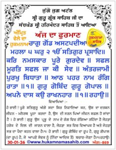 HomeHukamnama Sahibਅੱਜ ਦਾ ਹੁਕਮਨਾਮਾ ਸ੍ਰੀ ਹਰਿਮੰਦਿਰ ਸਾਹਿਬ ਅੰਮ੍ਰਿਤਸਰ Hukamnama Sahib ਅੱਜ ਦਾ ਹੁਕਮਨਾਮਾ ਸ੍ਰੀ ਹਰਿਮੰਦਿਰ ਸਾਹਿਬ ਅੰਮ੍ਰਿਤਸਰ By Gurpreet Singh January 30, 2026 0 29 Share FacebookTwitterPinterestWhatsApp Tags#Ajj da hukamnama#Amritsar#Dharmic posts#hukamnama Share FacebookTwitterPinterestWhatsApp Previous articleਬਾਲੀਵੁੱਡ ਗਾਇਕ ਅਰਿਜੀਤ ਸਿੰਘ ਨੇ ਸੰਨਿਆਸ ਲੈਣ ਦਾ ਕੀਤਾ ਐਲਾਨNext articleਵਿਰਾਟ ਕੋਹਲੀ ਦਾ ਇੰਸਟਾਗ੍ਰਾਮ ਅਕਾਊਂਟ ਅਚਾਨਕ ਗਾਇਬ, ਸੋਸ਼ਲ ਮੀਡੀਆ ’ਤੇ ਮਚੀ ਹਲਚਲ Gurpreet Singhhttps://rajneetiyug.com/ RELATED ARTICLES Hukamnama Sahib ਹੁਕਮਨਾਮਾ ਸ੍ਰੀ ਦਰਬਾਰ ਸਾਹਿਬ ਅੰਮ੍ਰਿਤਸਰ January 31, 2026 Hukamnama Sahib ਅੱਜ ਦਾ ਹੁਕਮਨਾਮਾ ਸ੍ਰੀ ਦਰਬਾਰ ਸਾਹਿਬ ਅੰਮ੍ਰਿਤਸਰ January 29, 2026 Hukamnama Sahib ਅੱਜ ਦਾ ਹੁਕਮਨਾਮਾ ਸ੍ਰੀ ਦਰਬਾਰ ਸਾਹਿਬ ਅੰਮ੍ਰਿਤਸਰ January 27, 2026 LEAVE A REPLY Cancel reply Comment: Please enter your comment! Name:* Please enter your name here Email:* You have entered an incorrect email address! Please enter your email address here Website: Save my name, email, and website in this browser for the next time I comment. - Advertisment - Most Popular ਲਾਈਫਸਟਾਇਲ: ਕੇਲੇ ਦਾ ਛਿਲਕਾ – ਸੁੰਦਰਤਾ ਅਤੇ ਸਿਹਤ ਦਾ ਅਨਮੋਲ ਖਜ਼ਾਨਾ January 31, 2026 ਖੀਰੇ ਨਾਲ ਚਮਕਦਾਰ ਸਕਿੰਨ ਲਈ 3 ਆਸਾਨ ਫੇਸ ਪੈਕ January 31, 2026 ਭ੍ਰਾਮਰੀ ਪ੍ਰਾਣਾਯਾਮ: ਮਾਨਸਿਕ ਸ਼ਾਂਤੀ ਲਈ ਇੱਕ ਸਰਲ ਉਪਾਯ January 31, 2026 ਅਸੀਂ ਰਸੋਈ ਨੂੰ ਸਾਫ ਸੁਥਰੀ ਕਿਵੇਂ ਰੱਖ ਸਕਦੇ ਹਾਂ? ਆਓ ਜਾਣੀਏ January 31, 2026 Load more Recent Comments